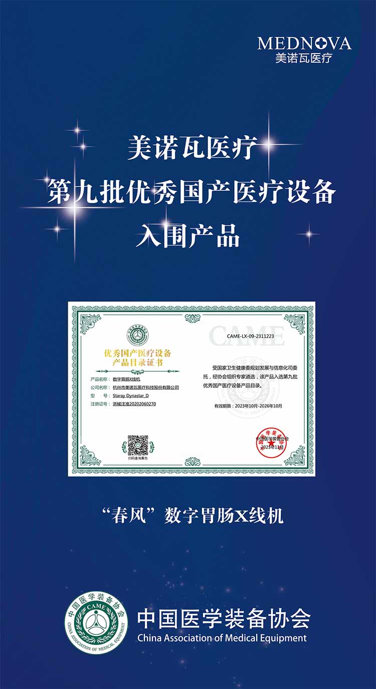由国家卫健委主导的第九批优秀国产医疗设备遴选中,美诺瓦医疗凭借对数字胃肠X线机临床应用创新,春风系列实力入围。这已是春风系列第二次入选优秀国产数字胃肠X线设备目录,代表着春风系列在功能性、智能性及创新性上都已获得业界认可。