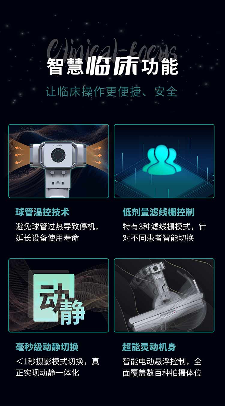 美诺瓦医疗历经三年技术研发,立足临床需求,采用低剂量控制技术,自主研发动态平板影像采集技术,毫米级动静拍摄模式切换,突破传统胃肠机技术束缚,为数字胃肠添加高端的临床解决方案。